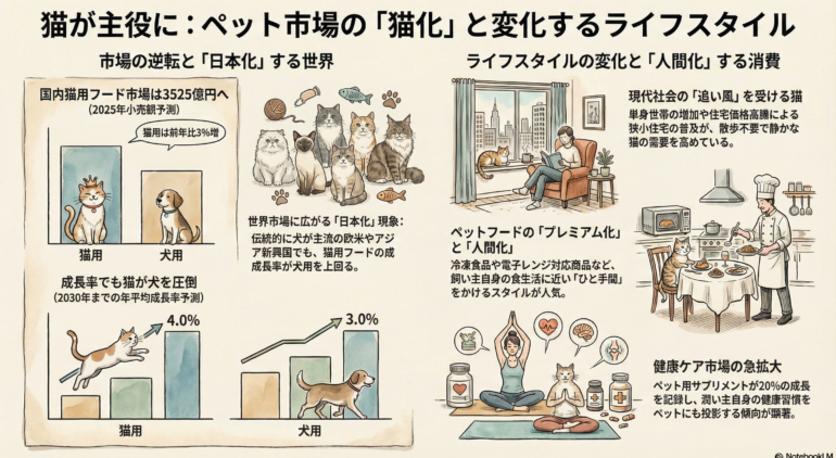 市場が成熟し、顧客の可処分所得や時間が減る中で、「手軽さ」と「高付加価値」の両立がカギとなります。大型・多機能よりも、狭い隙間にフィットしつつ、飼い主の自己投影(サプリや冷凍食)を満たすニッチで深いサービスに、中小企業の勝機が隠れています。